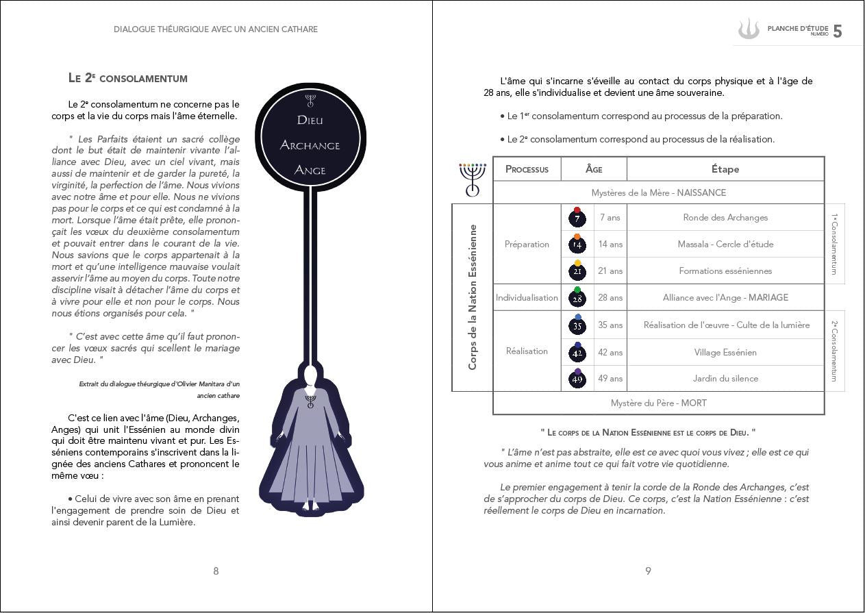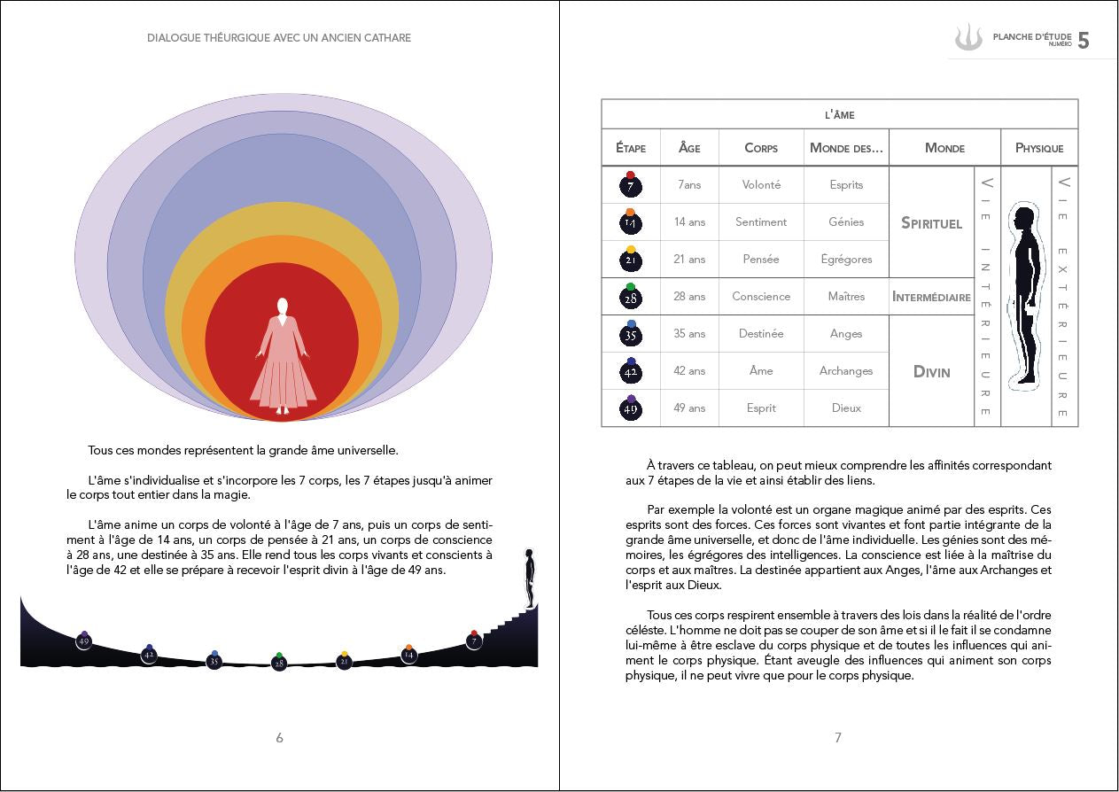 Les cathares qu'on appelait aussi les parfaits étaient des gardiens de l'âme et avaient mis en place toute une organisation, une discipline, des rituelles pour préserver l'âme. Ils avait mis en place 2 consolamentums : Prendre le premier engagement c’était rencontrer Dieu dans le corps. C’était un contact de corps à corps. L’homme est incorporé, il prend l’engagement de marcher sur un chemin d’éveil, d’étude et de discipline. Le deuxième engagement est donné par l’âme envers Dieu, non dans son corps mais dans son esprit immortel. Cette planche révèle à travers un dialogue théurgique avec un ancien cathare l'âme qui s'incarne à travers les 7 jours de la création et en explique les fondements.